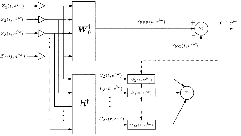 FBF 输出$Y_{mathrm{FBF}}left(t, e^{j omega}right)=boldsymbol{W}_{0}^{dagger}left(e^{j omega}right) boldsymbol{Z}left(t, e^{j omega}right)$