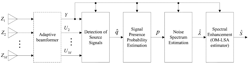 Cohen和Berdugo [16]首先提出了一种处理非平稳噪声源的方法。 这种后置滤波方法与经典的Griffiths和Jim GSC波束形成器结合使用,并且利用了波束形成器的输出和由阻塞分支产生的噪声参考信号,从而构成了多麦克风后置滤波。