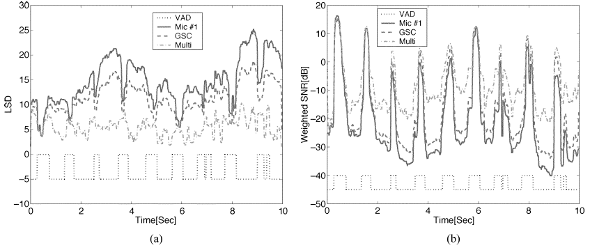 跟踪LSD和W-SNR优点随时间的变化也很有趣。在图10中,给出了汽车噪声情况下两种质量测量方法的轨迹。为了方便起见,图中还描述了VAD决策。结果表明,在TF-GSC输出中使用多麦克风后置滤波器可以提高性能。在非活动演讲期间,这两种质量测量方法的改善尤其令人印象深刻。