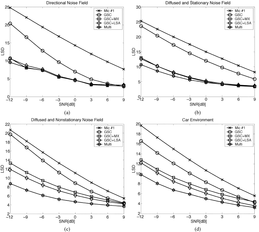 图8给出了W-SNR的结果。同样,一般来说,使用多麦克风后置滤波器可获得最佳性能(最高W-SNR)。其重要性在非平稳噪声(非平稳扩散噪声和汽车噪声)情况下更为明显。在定向(和静止)噪声场中,MIXMAX后置滤波器和多麦克风后置滤波器的性能几乎相同。然而,TF-GSC在没有任何后置滤波的情况下取得了很好的效果。LSD结果如图9所示。很明显,LSD质量度量的结果与前面的讨论是一致的。