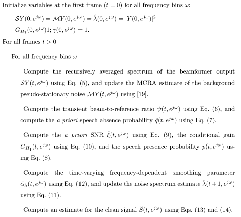 是OM-LSA增益函数,$G_{min}$表示无语音时增益的下限约束。图4总结了多通道后置滤波算法的实现。表II给出了8 kHz采样率下各参数的典型值。