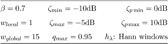 对于OM-LSA算法,STFT使用256个样本长度(32 ms)的Hamming窗口和64个样本帧更新步骤(75%重叠帧)实现。利用改进的决策导向方法估计先验信噪比,$alpha=0.92$。光谱增益被限制在最小20 dB,噪声PSD被估计使用改进的MCRA技术[19]。用于估计先验语音缺失概率的参数值汇总在表一中(估计器及其参数在[15]中描述)。