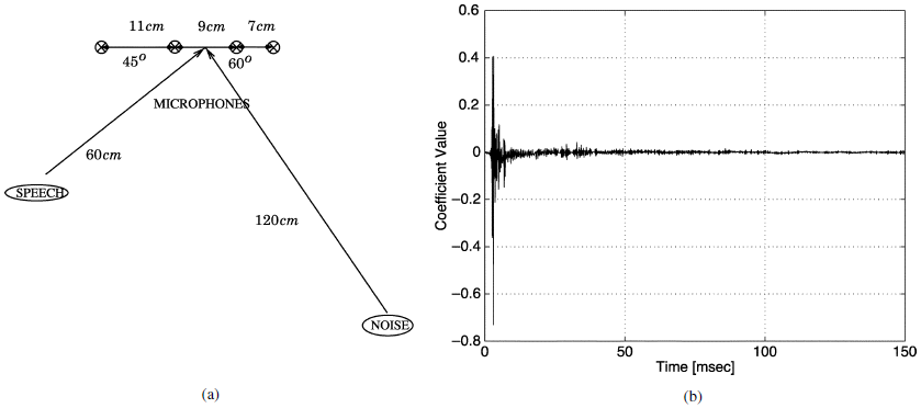 对于会议室,研究了图5所示的场景。围墙是一个尺寸为5米×4米×2.8米的会议室,在房间中央的一张桌子上放置了一个线性阵列。使用了两个扬声器。一个用于语音源,另一个用于噪声源。它们的位置和四个麦克风的位置如图5的左侧所示。图的右侧描绘了从语音源到第一个麦克风的脉冲响应。该响应是使用输入信号源和接收到的麦克风信号(响应包括扬声器)之间的最小二乘拟合来获得的。我们注意到,在我们所有的实验中,我们使用了实际的记录,而没有使用估计的脉冲响应。