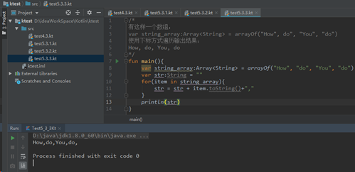 运用kotlin中的for循环将数组中的元素拼接成字符串,然后输出字符串