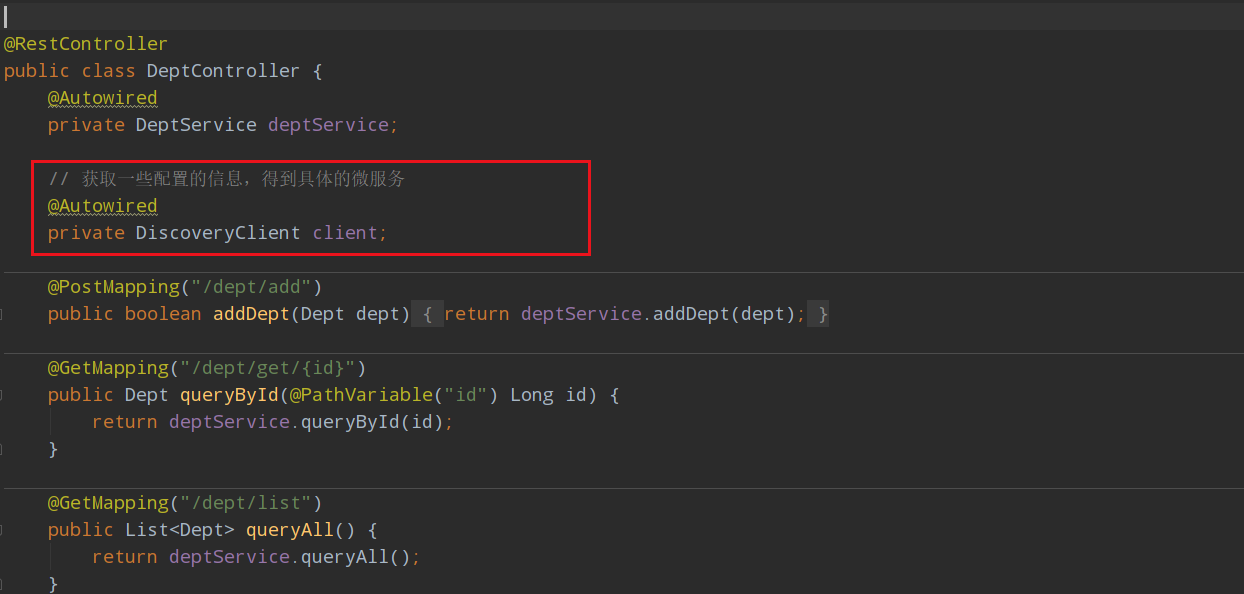 对于注册进eureka里面的微服务,可以通过服务发现来获得该服务的信息。【对外暴露服务】