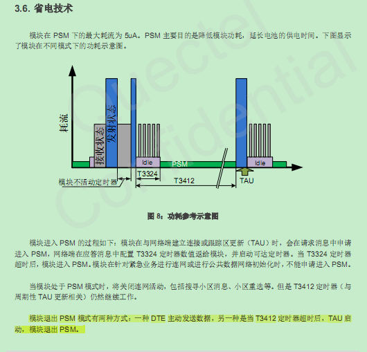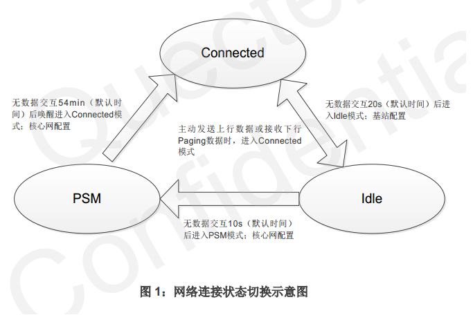 三种连接状态下,均可发送上行数据( CoAP/UDP); IDLE 下发送数据, 模块会进入 CONNECT 状态; PSM 下发送是数据会唤醒模块, 进入 CONNECT,或者当 TAU(TAU 的时长是指从进入 IDLE 开始一直到 PSM 模式结束) 超时,模块唤醒, 进入 CONNECT。