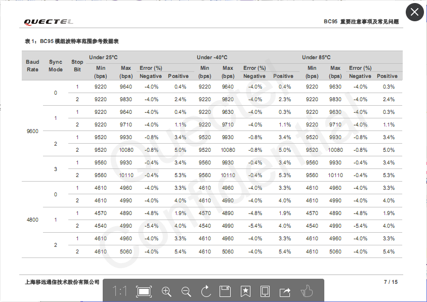 BC95 模组主串口波特率在 9600bps 和 4800bps 时,上下限范围如下图所示。外部 MCU 选型时,请 注意 MCU 的串口波特率不能超出模组主串口波特率的允许范围,否则会引起通讯异常。使用时请参考 Quectel_BC95_AT_Commands_Manual 文档中的AT+NATSPEED 指令,选择串口合适的<sync_mode> 及<stopbits>参数值。
