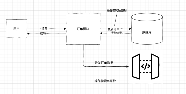 但是,从用户结算成功到更新订单状态这一系列的流程是同步的,假设这一系列流程所花费的时间是 n 毫秒。这就意味着,用户需要等待至少 n 毫秒。如果再加上传给数据审计部门的操作时间,假设为 m 毫秒,则整个用户就需要等待就 n+m 毫秒。