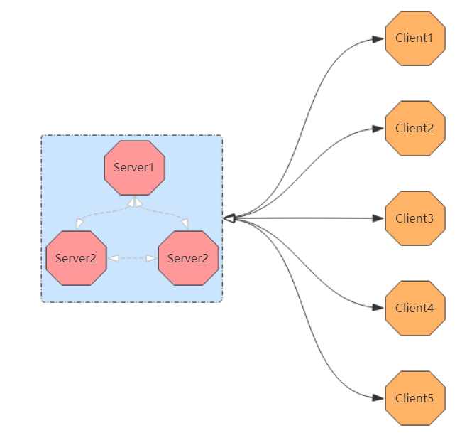 如上图所示:Client端之间是相互独立的不进行通信,而是通过Server端进行数据交换。Server端成为了中心枢纽,Server端会运行多个节点,通过节点之间的数据同步,保证系统高可用。