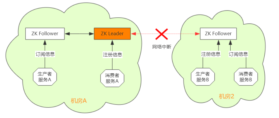 如上图所示: ZK集群部署在机房1、机房2两个机房中,ZK Leader部署在机房1,两个机房还部署了ZK Follower、生产者服务与消费者服务,并且,由于某些不稳定原因两个机房的网络中断了。