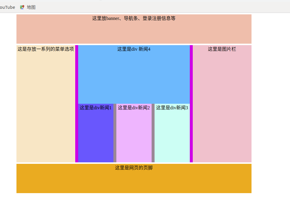 试着做一些综合性的练习,后期做的页面丰富性会高一点的。导航条在网页中非常常见的,网页中的导航器或者导航条一般都是用无序列表制作的,今天我做了一个简单的导航条和一个简单的布局框架。