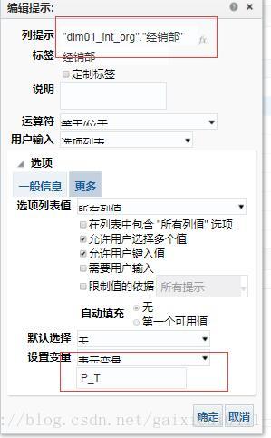 做法步骤:提示器的制作,选择普通列经销部字段,并将该提示器设置表示变量p_t