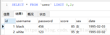 查询前两条记录: SELECT * FROM `user` LIMIT 0,2;