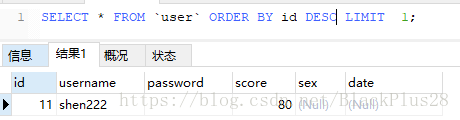 查询最后一条记录: SELECT * FROM `user` ORDER BY id DESC LIMIT 1;