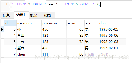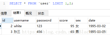 查第二和第三条记录: SELECT * FROM `user` LIMIT 1,2;
