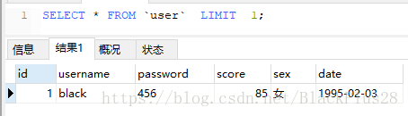 查询第一条记录: SELECT * FROM `user` LIMIT 1;