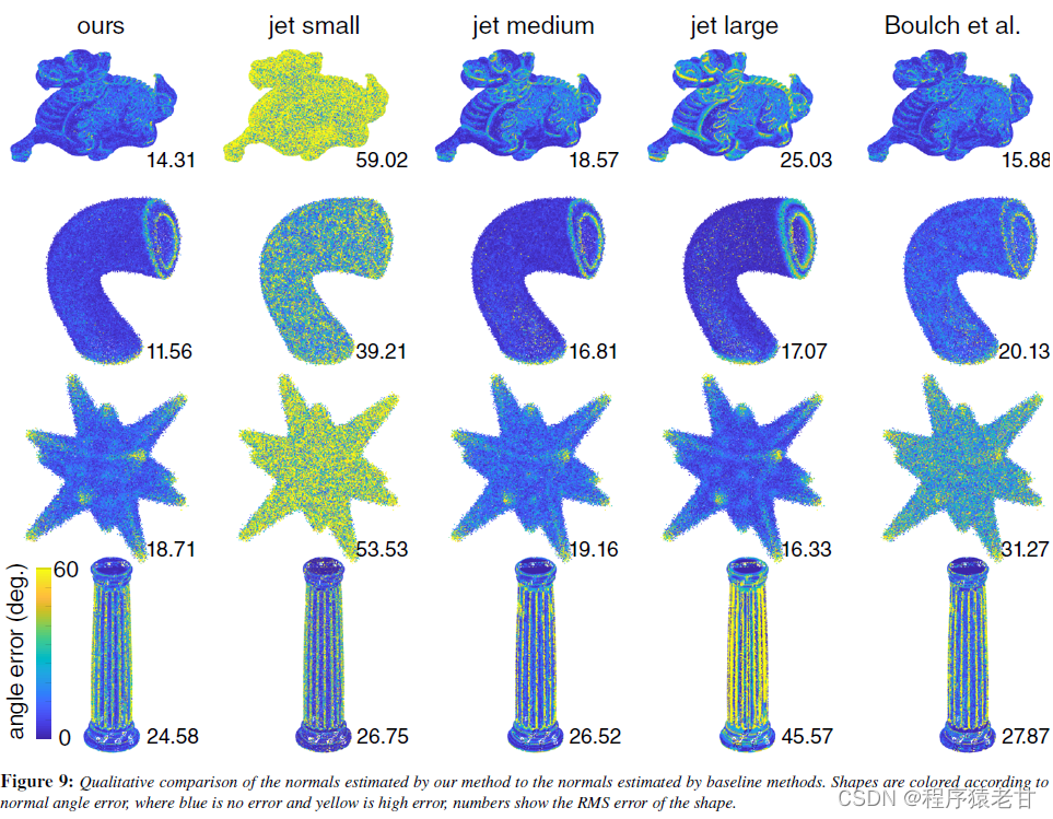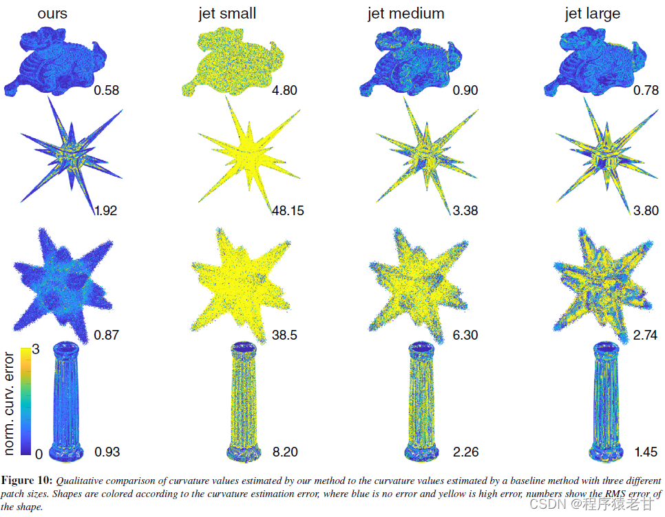 这个给出原文的两幅实验图作为参考。根据量化的误差色温图可以看到,PCPNet对于局部特征估计任务能够提供不错的计算结果。