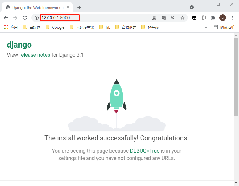 看到这个页面表示你的Django项目已经可以访问。