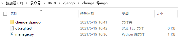 这里我新建一个名为:chenge_django的Django项目。执行上面命令后,在文件夹会出现如下文件和文件夹。