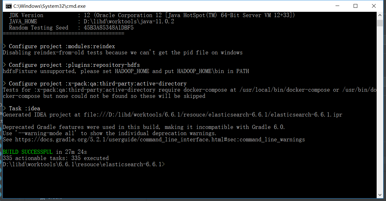 (1) 进入elasticsearch6.6.1源码主目录下,打开cmd,执行gradle idea,开始漫长的build过程~