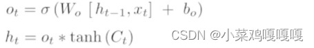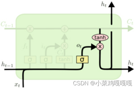输出门:输出门是最后经过的门控,它决定着我们模型最后的输出值。首先用sigmoid层来确定细胞状态的哪部分进行输出,接着我们将细胞状态通过tanh层处理,处理后的值是-1到1之间,将他们两部分逐点相乘得到的结果就是当前时间步的输出,也叫做当前时间步的隐藏状态。