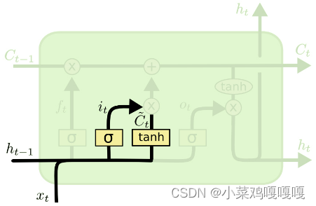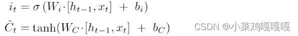 输入门:输入门是第二个通过的门控结构,他可以决定有多少新的信息加入到细胞状态中。输入门门控分为两个部分,第一部分由sigmoid层决定要更新那些信息,和遗忘门相似,第二部分是使用tanh层新生成一个向量,代表着备选的用来更新的内容,叫做候选记忆细胞。最后将这两部进行逐点相乘,对细胞状态进行更新。