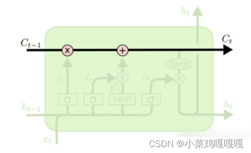 细胞状态只得就是最上边水平得那个。细胞状态的改变受到遗忘门和输入门的影响,输出门不改变细胞状态的值。