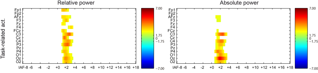 上图为ADHD儿童的神经可塑性变化。显示了绝对和相对活动的频率传感器图。频率范围是相对于个体的alpha值表示的,即alpha的上部对应于[0-2]区间。观察到alpha节律的绝对和相对活动显着增加,最突出的是在中央和顶枕区最明显。