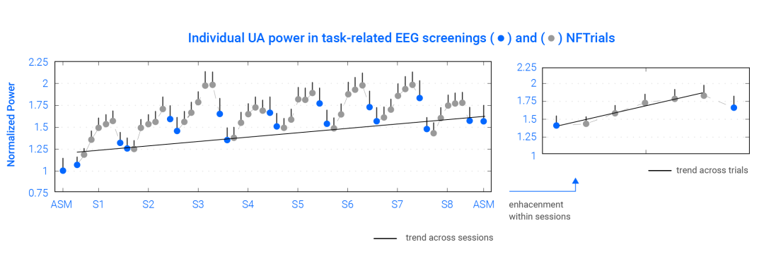 上图中,EEG筛查(黑点,前-后阶段)和训练试验(灰色点) 显示了这8个训练过程的alpha活性。可以看到一个积极的趋势,这表明人们正在学习自我调节的过程。