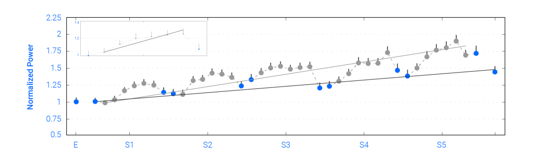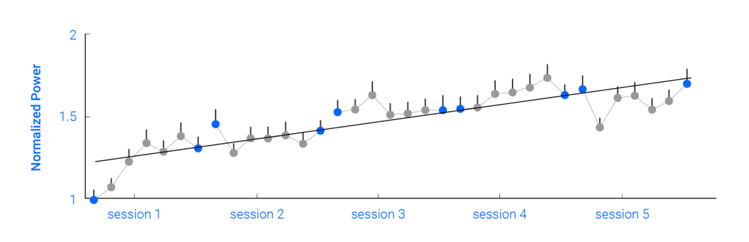 上图中在EEG筛查(黑点,前-后阶段)和训练试验(灰色点)显示了5个训练阶段的alpha活动。可以看到一个积极的趋势,这表明人们正在学习自我调节的过程。左上角的框显示了会话内的alpha活动(会话间的平均值),也显示了一个积极的趋势。