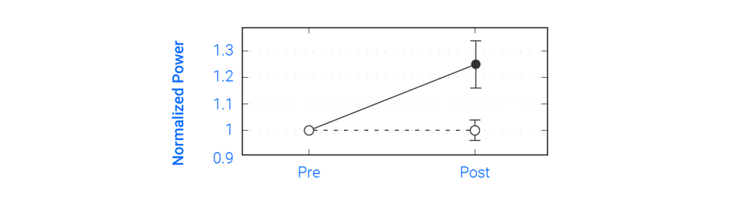 上图神经塑性变化:显示了实验组(黑点)和对照组(白点)的alpha节律增加(研究前/研究后),相对于第一次测量已标准化。