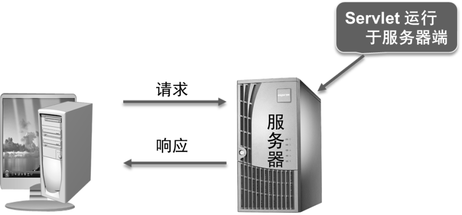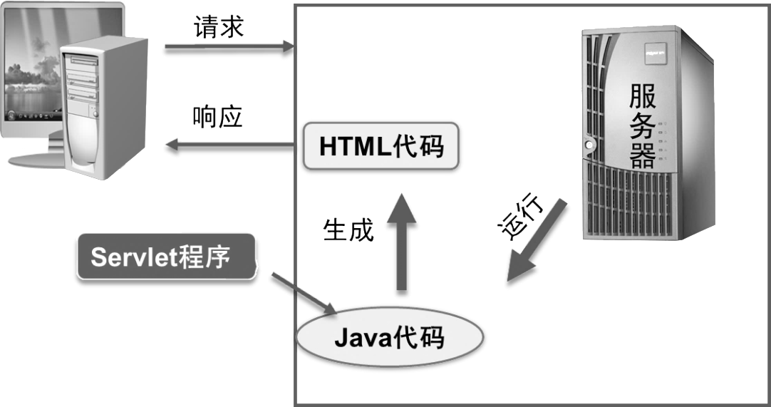 在JSP技术出现之前,如果要生成动态HTML页面,只能在服务器上运行Java程序,并生成HTML格式内容。Servlet就是运行在服务器端的Java程序。如下图所示: