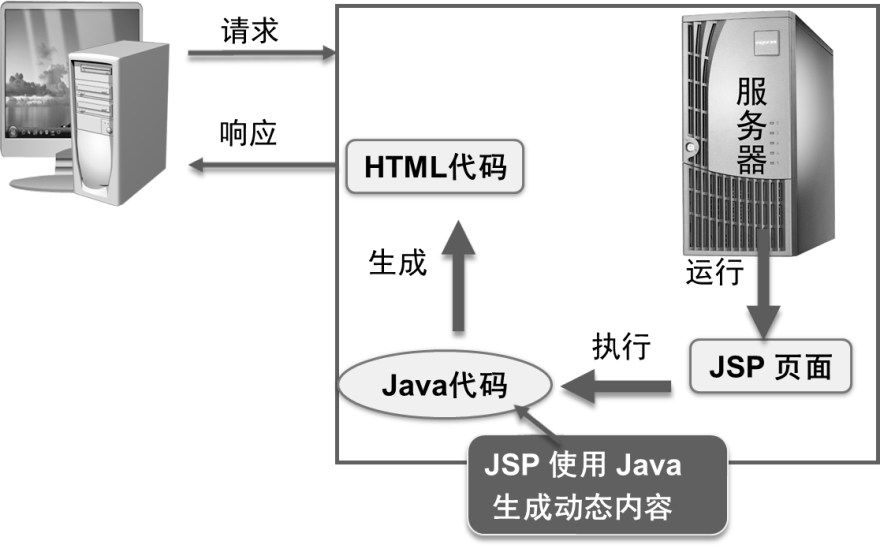 JSP中写入java代码,服务器运行JSP文件时,执行Java代码,动态获取数据,并生成HTML代码,响应到客户端,最终在客户端浏览器上显示。