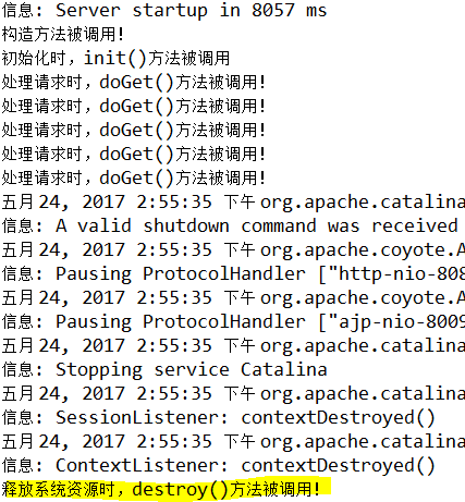 | void destroy() | 由 servlet 容器调用,释放Servlet对象所使用的资源 |