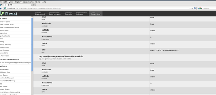 The following settings should be configured for each Neo4j installation. Neo4j instance #1—~/neo4j-01 conf/neo4j.properties: Unique server id for this Neo4j instance can not be negative id and must be unique ha.server_id = 1 IP and port for this instance to bind to for communicating data with the other neo4j instances in the cluster. ha.server = 127.0.0.1:6363 online_backup_server = 127.0.0.1:6366 IP and port for this instance to bind to for communicating cluster information with the other neo4j instances in the cluster. ha.cluster_server = 127.0.0.1:5001 List of other known instances in this cluster ha.initial_hosts = 127.0.0.1:5001,127.0.0.1:5002,127.0.0.1:5003 conf/neo4j-server.properties database location org.neo4j.server.database.location=data/graph.db http port (for all data, administrative, and UI access) org.neo4j.server.webserver.port=7474 High Availability 424 https port (for all data, administrative, and UI access) org.neo4j.server.webserver.https.port=7484 HA - High Availability SINGLE - Single mode, default. org.neo4j.server.database.mode=HA Neo4j instance #2—~/neo4j-02 conf/neo4j.properties: Unique server id for this Neo4j instance can not be negative id and must be unique ha.server_id = 2 IP and port for this instance to bind to for communicating data with the other neo4j instances in the cluster. ha.server = 127.0.0.1:6364 online_backup_server = 127.0.0.1:6367 IP and port for this instance to bind to for communicating cluster information with the other neo4j instances in the cluster. ha.cluster_server = 127.0.0.1:5002 List of other known instances in this cluster ha.initial_hosts = 127.0.0.1:5001,127.0.0.1:5002,127.0.0.1:5003 conf/neo4j-server.properties database location org.neo4j.server.database.location=data/graph.db http port (for all data, administrative, and UI access) org.neo4j.server.webserver.port=7475 https port (for all data, administrative, and UI access) org.neo4j.server.webserver.https.port=7485 HA - High Availability SINGLE - Single mode, default. org.neo4j.server.database.mode=HA Neo4j instance #3—~/neo4j-03 conf/neo4j.properties: Unique server id for this Neo4j instance can not be negative id and must be unique ha.server_id = 3 IP and port for this instance to bind to for communicating data with the other neo4j instances in the cluster. ha.server = 127.0.0.1:6365 online_backup_server = 127.0.0.1:6368 IP and port for this instance to bind to for communicating cluster information with the other neo4j instances in the cluster. ha.cluster_server = 127.0.0.1:5003 List of other known instances in this cluster ha.initial_hosts = 127.0.0.1:5001,127.0.0.1:5002,127.0.0.1:5003 conf/neo4j-server.properties database location High Availability 425 org.neo4j.server.database.location=data/graph.db http port (for all data, administrative, and UI access) org.neo4j.server.webserver.port=7476 https port (for all data, administrative, and UI access) org.neo4j.server.webserver.https.port=7486 HA - High Availability SINGLE - Single mode, default. org.neo4j.server.database.mode=HA