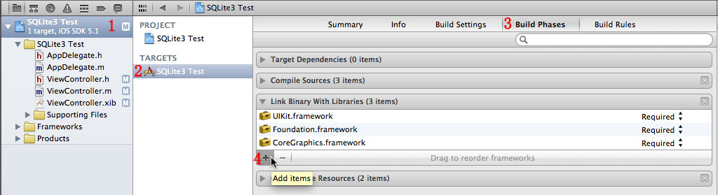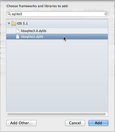 选择libsqlite3.dylib,单击Add,添加到工程。