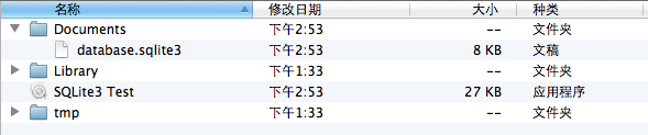 第一次运行程序时,在SandBox的Documents目录下出现数据库文件database.sqlite3: