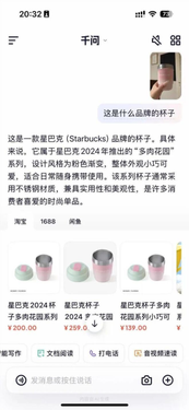 我们对最新版的千问App进行了测试,发现它已经嵌入了阿里的生态优势,比如当你拍照问它“这是什么品牌的杯子?”它不仅会回答你的问题,还能直接在下方提供了淘宝、1688和闲鱼三个平台的链接和价格,点击即可购买。