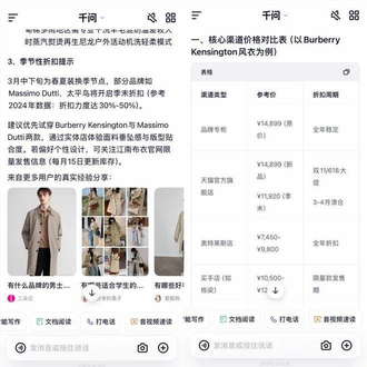 其次,在内容层面,千问App展现出更广的覆盖维度与更深的商业整合能力。当用户寻求“适合秋天的风衣”建议时,它不仅能整合KOL的评测内容进行智能推荐,更能启动全平台的实时比价系统——从官方正品保障的天猫旗舰店,到折扣力度的奥特莱斯渠道,乃至风格独特的设计师买手店,均可一览无余。