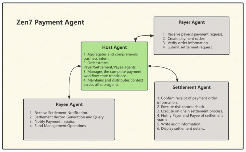 这一切的背后,正是 Zen7Payment Agent 所构建的多 Agent 协同支付架构——由 Payer Agent(付款方)、Payee Agent(收款方)、Settlement Agent(结算方)、Host Agent(协调方) 四类角色组成,自动完成从支付意图到资金结算的全过程。