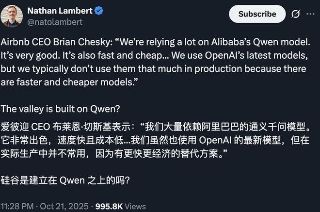 爱彼迎Airbnb的CEO Brian Chesky公开表示,他们公司正大量依赖阿里的Qwen模型。 他坦言,因为它非常出色,而且又快又便宜。