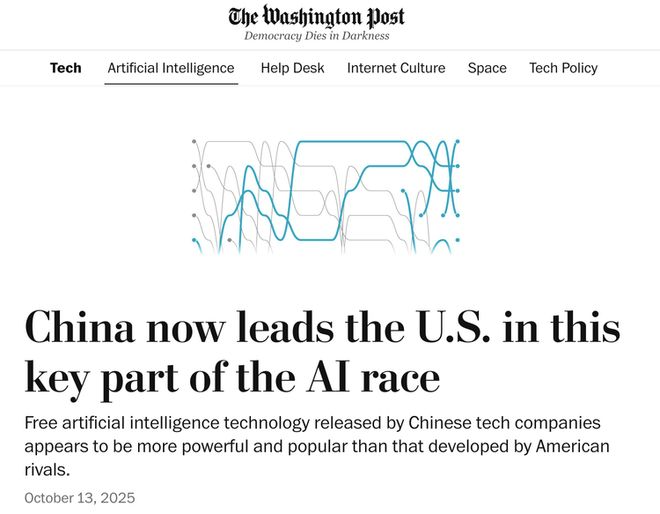 华盛顿邮报最近的分析文章标题一针见血,中国现在正在AI竞赛的这个关键部分领先美国。 报道称,AI热潮始于美国,但中国公司在开源AI技术方面正悄悄超越美国对手。 去年,最好的开源模型大多来自美国。 而现在,它们都来自中国。