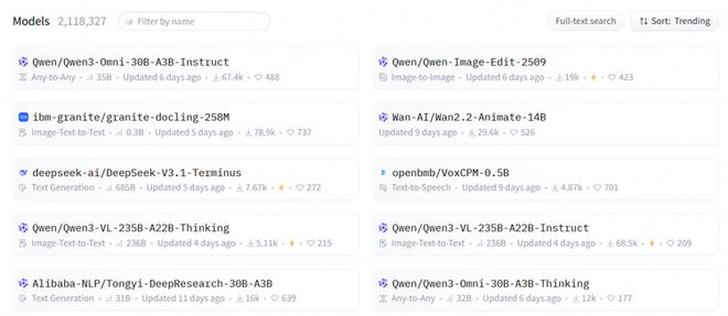 9月阿里在云栖大会上连发7款模型,在HuggingFace的大模型榜单中,阿里通义开源模型不但夺下第一,而且在前十中位居七席,妥妥的中国模型在全球屠榜。