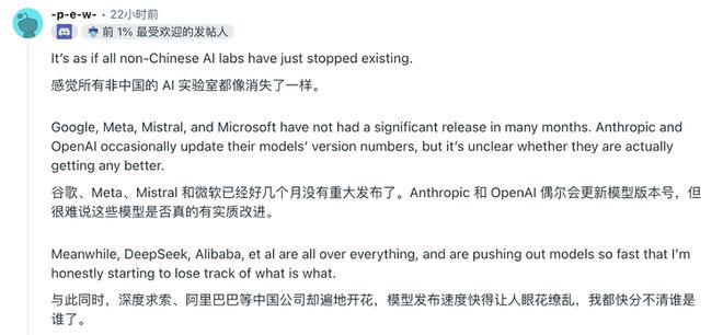 他表示,感觉所有非中国的AI实验室都像消失了一样。 谷歌、Meta、微软已经好几个月没有重大发布了。 与此同时,深度求索、阿里巴巴等中国公司却在遍地开花,模型发布快得让人眼花缭乱。