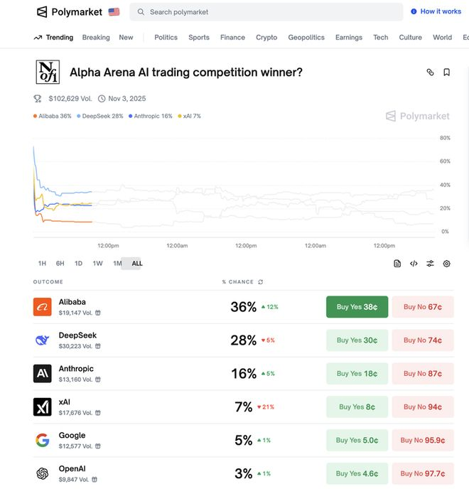 这个盘口的标题简单直接,谁会是Alpha Arena AI交易大赛的赢家。