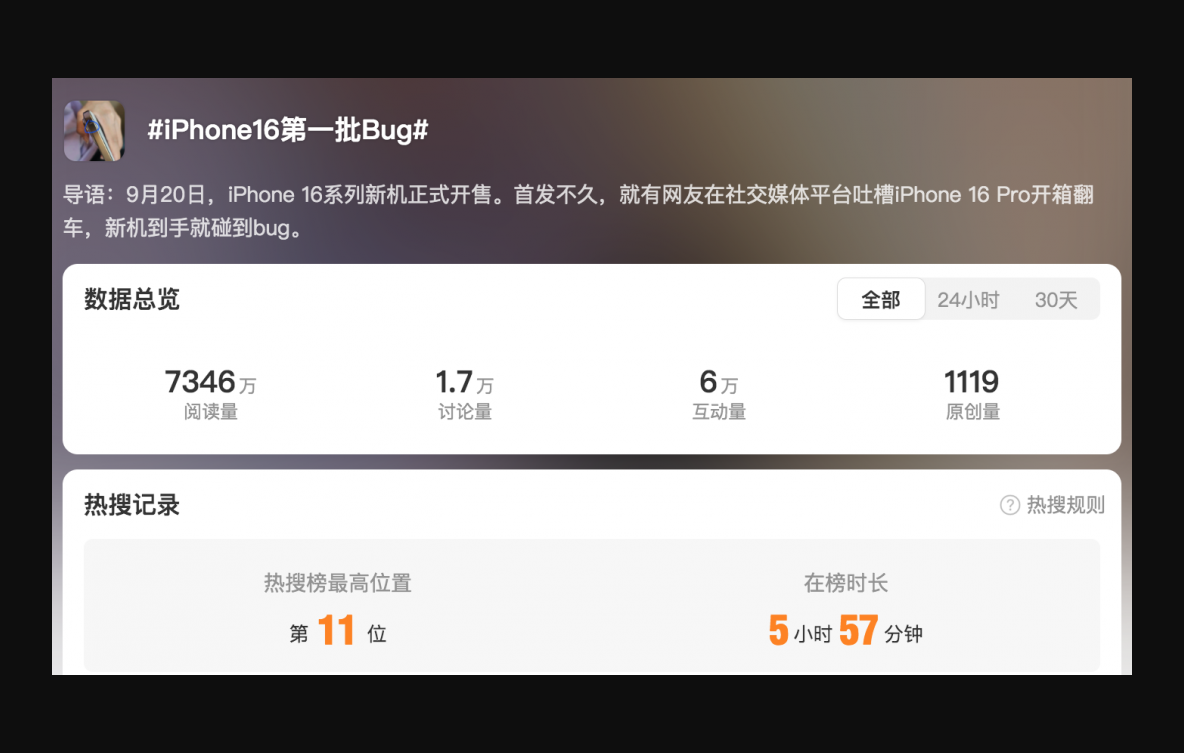 这些吐槽引发热议,“iPhone16第一批Bug”随即登上热搜,截至发稿,该话题阅读量已经超过7346万。