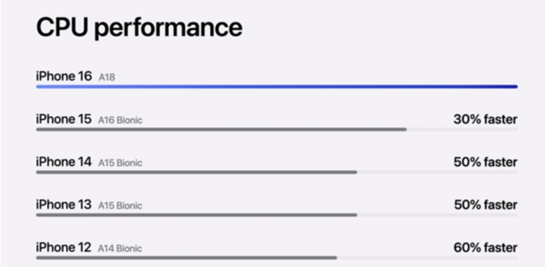 A18芯片集成了6个CPU核心,包括2个性能核和4个能效核。苹果官方宣称,A18的性能相比前代A16提升了30%,相比A15提升了50%,相比A14则提升了60%。