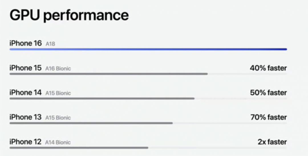 在GPU方面,A18采用了五个核心设计,相比A16、A15、A14分别提升了40%、50-70%、100%。虽然苹果没有直接对比A17 Pro,但可以预见,A18与A17 Pro在性能上的差距不会太大。