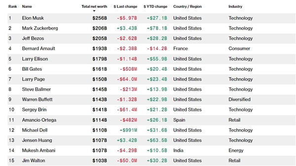 全球首富依然是特斯拉首席执行官埃隆·马斯克,其身价约为 2560 亿美元。