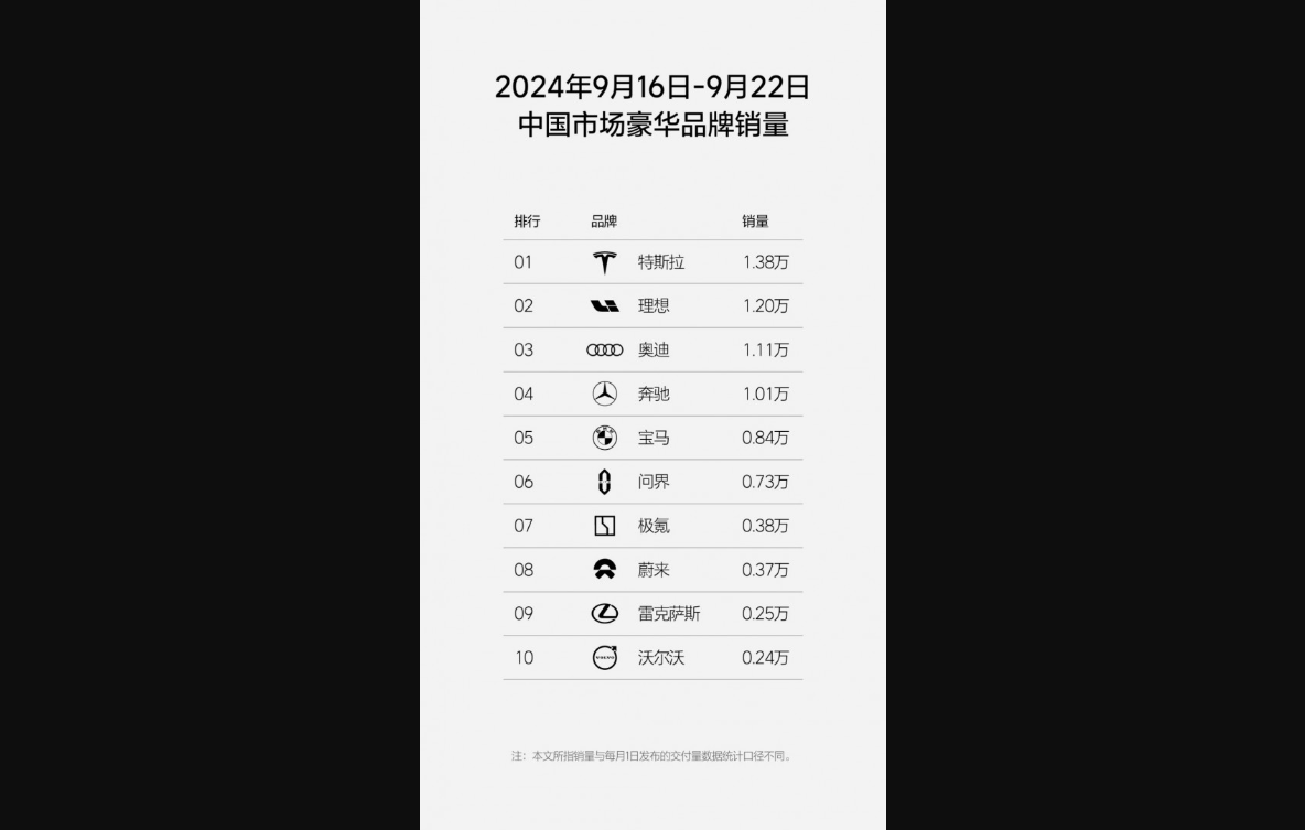 从理想公布的2024年9月16日-9月22日中国市场豪华品牌销量榜单来看,理想品牌销量已超越BBA,此外问界、极氪和蔚来也都取得了不错的销量成绩。在销量前十位的豪华品牌当中,自主品牌已占据四席。